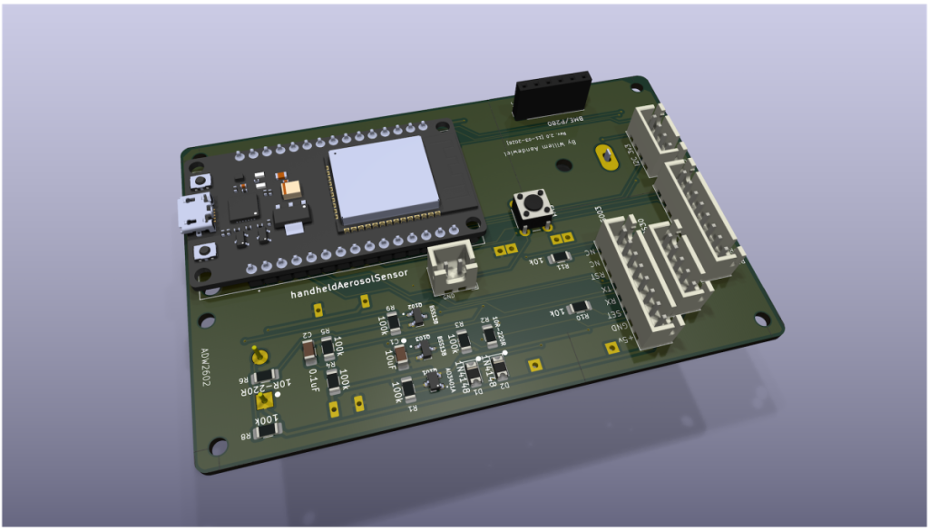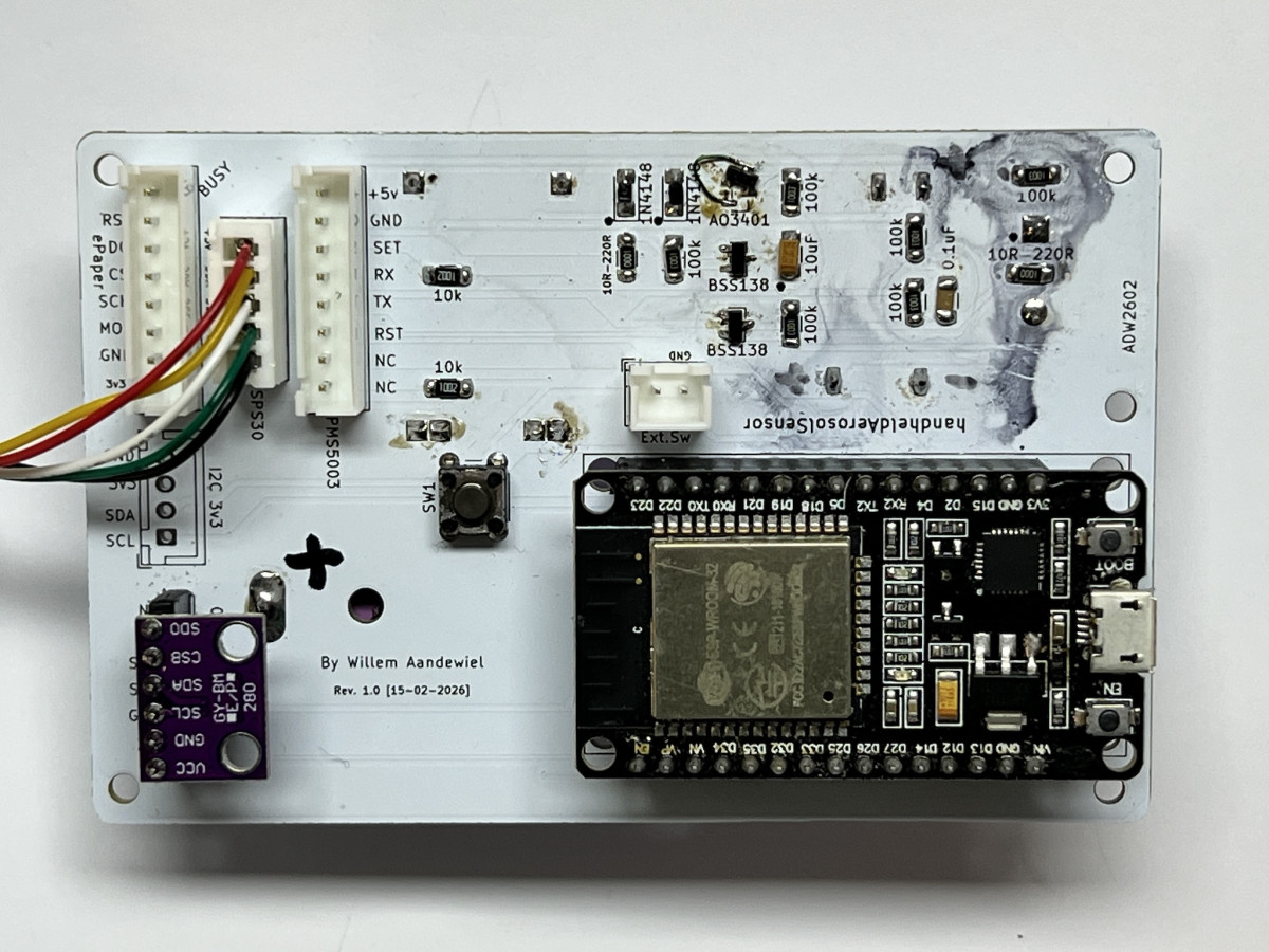 Using KiCad I designed a PCB with space for most of the components. Only the SPS30 and the e-Paper display are not mounted on the board but can be connected with standard 2.54″ pin headers or JST-XH connectors.