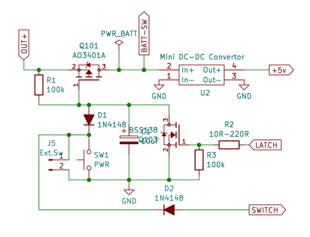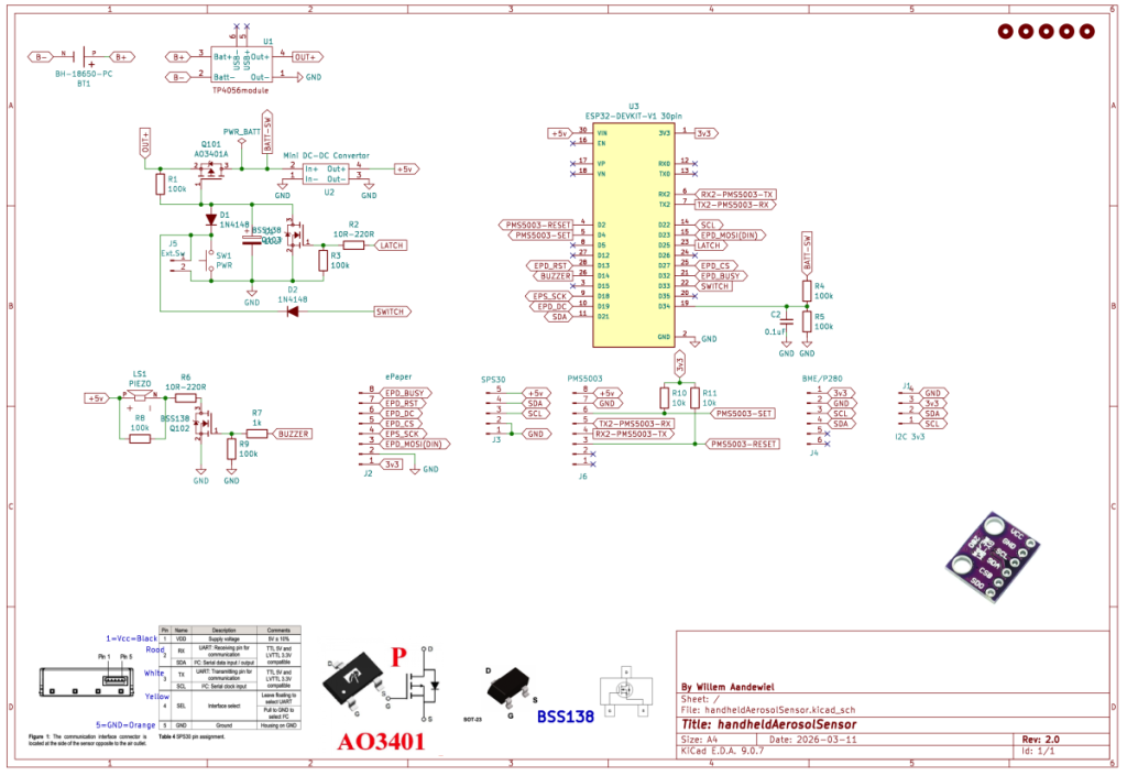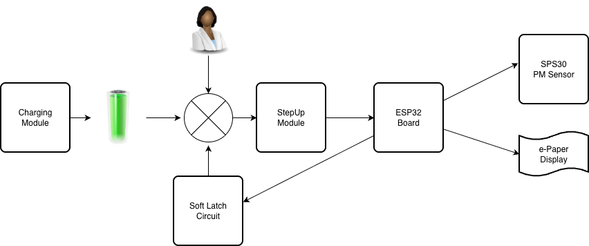 When the button (SW1) is briefly pressed, Q101 starts conducting and the ESP32, the SPS30 and the e-Paper display receive power.