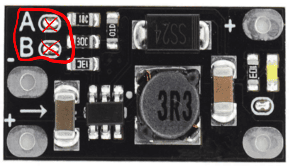 To obtain an output voltage of 5 volts the two 0-ohm resistors (next to A and B) must be removed.