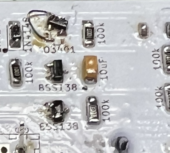 a p-channel MOSFET (AO3401) used as the power switch and an n-channel MOSFET (BSS138) for control.