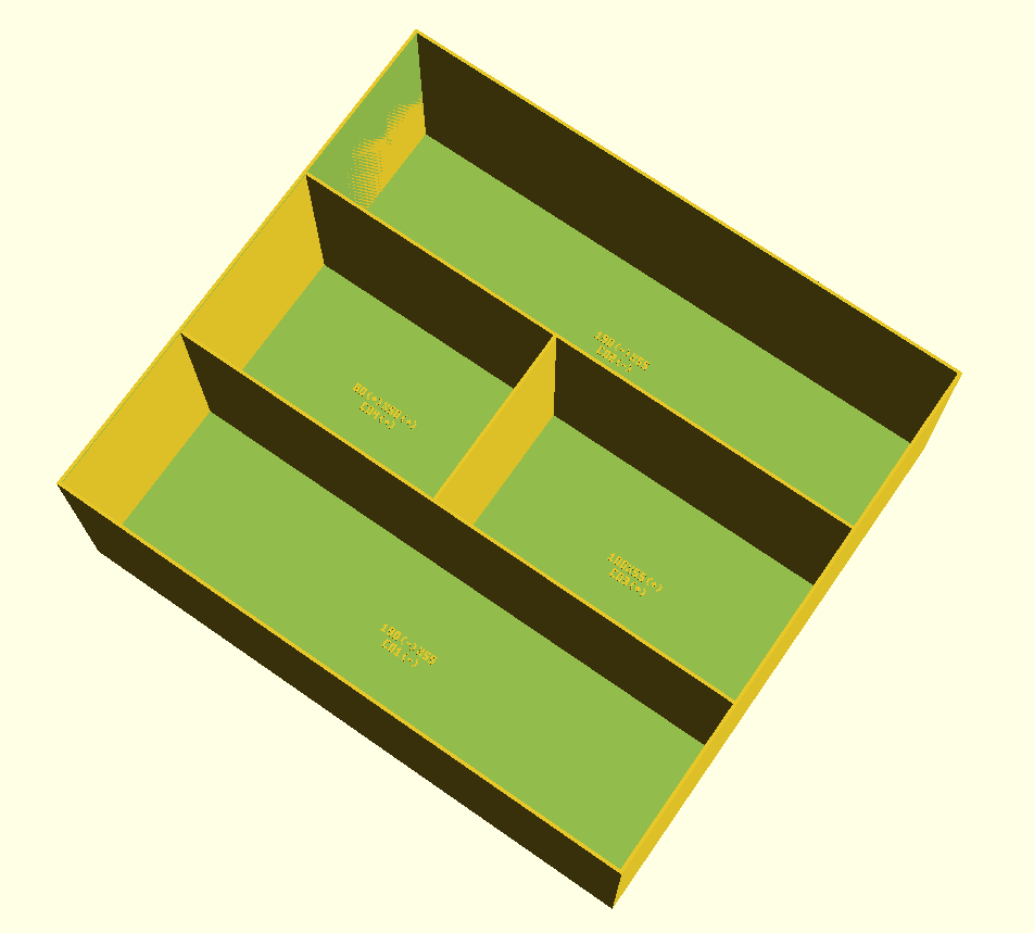 ./boxGenerator.py OpenSCAD box generator ---------------------- Select a project: [1] evenSpacers [2] ladeBox2 [3] newProject Choice [1-3]: 2 Project: ladeBox2 Enter outer box size (length x width x height, example: 300x200x80): 190x172x70 <Enter> Enter inner wall height in mm: 68.8 <Enter> Enter outer wall thickness in mm: 1 <Enter> Enter inner divider thickness in mm: 1 <Enter> Enter bottom thickness in mm: 1.2 <Enter> Enter leftover compartment size (length x width, '-' = skip): <Enter> Enter random seed [12345]: <Enter> Enter number of layout attempts [120]: <Enter> Enter number of attempts per cluster group [50]: <Enter> Enter compartment definitions. Example size: 25x30 Cluster size means how many equal compartments must touch each other. Example: size 25x30, count 8, cluster 3 => groups of 3, 3, and 2 Empty size reuses the default size and still shows the remaining questions. If no default exists yet, empty size finishes input. Use 'keep' to reuse a default compartment without editing. Use '0x0' to remove/skip a compartment and skip follow-up questions. Compartment 1 size (length x width) (empty = default-size, 'keep' = default-all, '0x0' = skip): 190x55 <Enter> Compartment 1 count: 2 <Enter> Compartment 1 cluster size: 1 <Enter> Compartment 1 preferred placement (random/front/back) [random]: <Enter> Compartment 2 size (length x width) (empty = default-size, 'keep' = default-all, '0x0' = skip): 100x55 <Enter> Compartment 2 count: 1 <Enter> Compartment 2 cluster size: 1 <Enter> Compartment 2 preferred placement (random/front/back) [random]: <Enter> Compartment 3 size (length x width) (empty = default-size, 'keep' = default-all, '0x0' = skip): 80x50 <Enter> Compartment 3 count: 1 <Enter> Compartment 3 cluster size: 1 <Enter> Compartment 3 preferred placement (random/front/back) [random]: <Enter> Compartment 4 size (length x width) (empty = default-size, 'keep' = default-all, '0x0' = skip): <Enter> Packing progress: attempt 1/120, best placed compartments 3/4, current missing compartments 3 Packing progress: attempt 10/120, best placed compartments 3/4, current missing compartments 3 Packing progress: attempt 20/120, best placed compartments 3/4, current missing compartments none Packing progress: attempt 30/120, best placed compartments 4/4, current missing compartments none Packing progress: attempt 40/120, best placed compartments 4/4, current missing compartments 3 Packing progress: attempt 50/120, best placed compartments 4/4, current missing compartments none Packing progress: attempt 60/120, best placed compartments 4/4, current missing compartments 3 Packing progress: attempt 70/120, best placed compartments 4/4, current missing compartments 3 Packing progress: attempt 80/120, best placed compartments 4/4, current missing compartments none Packing progress: attempt 90/120, best placed compartments 4/4, current missing compartments none Packing progress: attempt 100/120, best placed compartments 4/4, current missing compartments none Packing progress: attempt 110/120, best placed compartments 4/4, current missing compartments none Packing progress: attempt 120/120, best placed compartments 4/4, current missing compartments none Placed cluster groups: group_1_1 position=(7.5, 0.0) footprint=180.5x55.0 cells=1 orientation=single pref=random/random group_1_2 position=(7.5, 115.0) footprint=180.5x55.0 cells=1 orientation=single pref=random/random group_2_1 position=(88.0, 60.0) footprint=100.0x55.0 cells=1 orientation=single pref=random/random group_3_1 position=(8.0, 55.0) footprint=80.0x50.0 cells=1 orientation=single pref=random/random Requested cavities: requested_01 position=(0.0, 0.0) size=188.0x55.0 requested_02 position=(0.0, 115.0) size=188.0x55.0 requested_03 position=(88.0, 55.0) size=100.0x60.0 requested_04 position=(0.0, 55.0) size=88.0x60.0 Remaining free cavities: None Absorbed tiny gaps between requested cavities: adjustment_01 axis=y between=requested_01/requested_03 gap=5.000 growth=+0.000/+5.000 adjustment_02 axis=y between=requested_04/requested_02 gap=10.000 growth=+10.000/+0.000 OpenSCAD file written: ladeBox2.scad STL file written: ladeBox2.stl