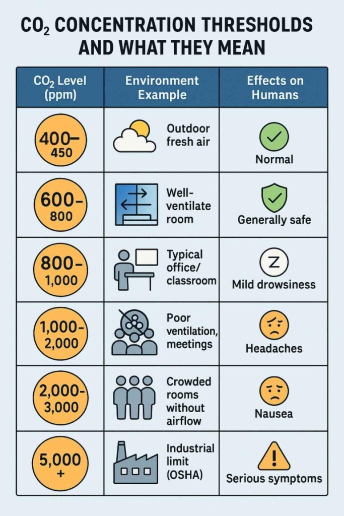 Geeft aan hoe goed een ruimte geventileerd is. Het geeft aan hoeveel uitgeademde lucht zich in de gemeten ruimte bevindt. Hoge waarde is benauwde lucht (ramen oipenzetten).