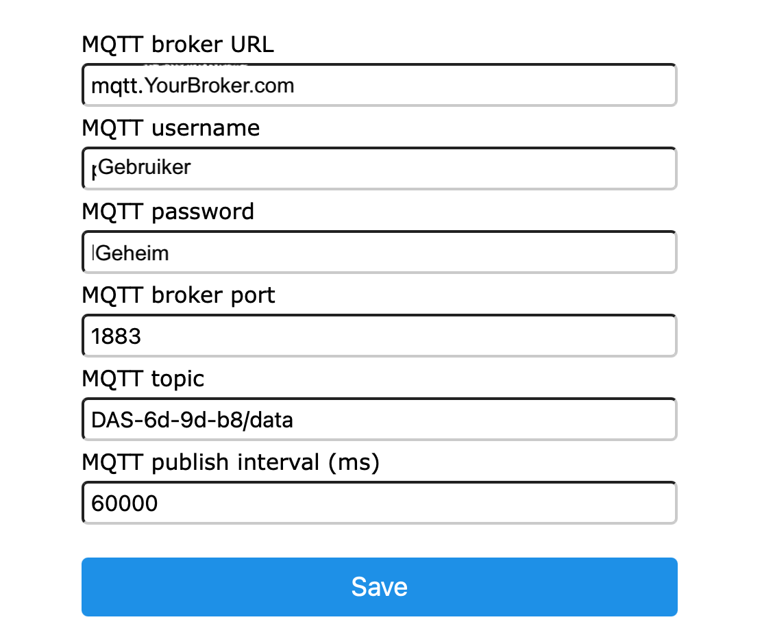 Je moet dan je computer, tablet of telefoon tijdelijk verbinden met het Access Point van de Desktop Luchtkwaliteit Meter en daarna in het portal (of, als die niet automatisch opstart moet je met een browser naar “http://192.168.4.1” surfen) de nodige gegevens invoeren.