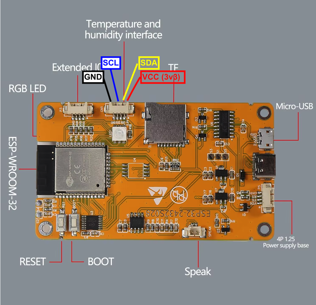 Op het display controller bordje zit een I2C interface die we mooi kunnen gebruiken om de SEN66 aan te sluiten. In tegenstelling tot de PMS5003 ‘werkt’ de SEN66 al bij 3v3 en dat is precies wat ook op de I2C connector (de Temperature and Humidity interface) wordt aangeboden!