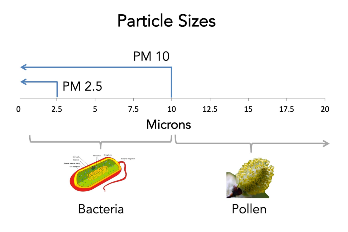 Fijnstof (PM1, PM2.5, PM4 en PM10). Dit zijn kleine stofdeeltjes in de lucht. PM1 en PM2.5 zijn hele kleine, gevaarlijke, deeltjes. PM10 zijn grotere delen zoals bijvoorbeeld gewoon stof en pollen.